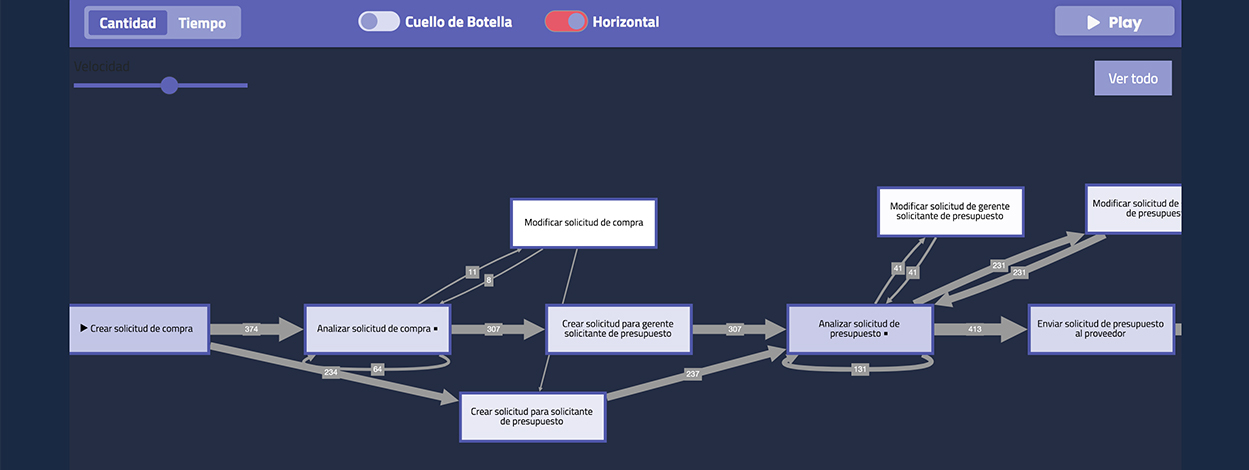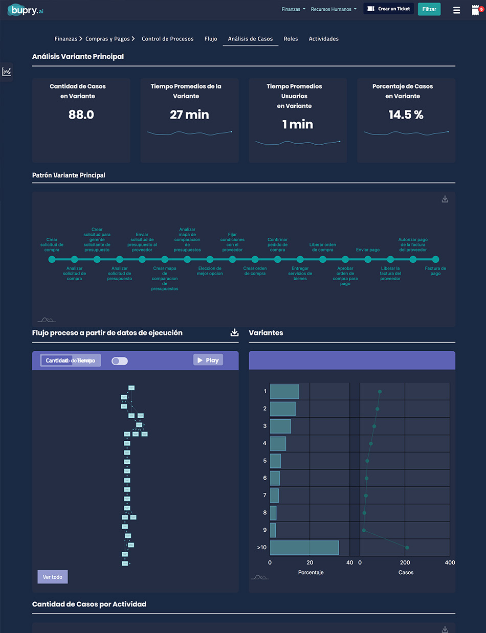 Bupry automatiza el análisis de los registros de procesos, generando un conjunto de gráficos interactivos que permiten, facilmente identender los procesos internos de las empresas, en todos sus aspectos, de recursos humanos, ventas, adquisiciones, logística, etc., e identificando eventos con mayor costo, demora y otros factores que impactan en el desempeño de las empresas y sus unidades.