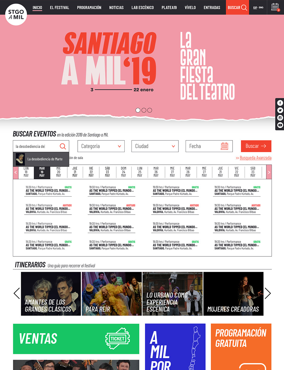 El desafío fue crear una plataforma fácil, amigable y profunda que pudiera atender las necesidades anuales del masivo y popular Festival Teatro a Mil, sirviendo a las cientos de miles de personas que son su público, con una gran diversidad de ubicación y acceso, de manera fluida, simple y completa. Adicionalmente, se debía visualizar y promover toda la actividad desarrollada por la Fundación durante el resto del año.